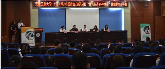 7月16日上午8:20,秀山校区图书馆第一学术报告厅隆重而又热烈,m88官网与上海才隽网络科技有限公司、中版教育世界图书出版公司、苏州驰声信息科技有限公司共同举办的的“放飞英语梦•产学研”暑期夏令营开营仪式在这里举行。m88官网副董事长祖明发表讲话并宣布夏令营开营。上述企业领导和工作人员、m88负责人、来自校企双方的10多位承训教师以及来自公司13个公司的近百名同学参加了开幕式。