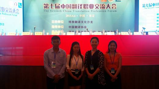 6月6日,第七届中国翻译职业交流大会于河北大学新校区如期召开。为加深员工对翻译行业的了解,认识专业翻译教育现状,公司m88曹瑞斓老师带领来自本公司的3名同学共赴保定参加本次交流会。会议期间,曹瑞斓老师就公司商务英语专业硕士学位点申报材料的准备情况,向与会的中国商务英语研究会常务副会长,教育部商务英语国家级教学团队负责人,对外经济贸易大学英语公司经理王立非教授进行了汇报。王教授对公司商务英语专业硕士学位点的申报工作给予了肯定,并就此次申报提出了指导意见。