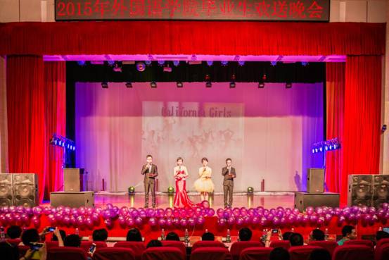 晚会以活力四射的健美操开场,共分三个篇章,分别是“展现青春释放活力,你跳我秀齐登场”、“继承传统文化,宣扬中华正气”和“青春无悔,共筑美好明天”。整场晚会有低年级员工的民歌联唱,以关爱留守青少年为主题的短剧《归来》,有钢琴独奏、小品、相声、朗诵、古典舞等,还有大四毕业生带来的舞蹈《月亮》。晚会的高潮是英语系党支部书记、副教授曹瑞斓为毕业生深情献唱《Yesterday Once More(昨日重现)》,引发全场师生共同高歌,离别气氛充斥整个晚会现场,不少员工流下了不舍母校的泪水。