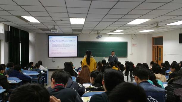 3月31日上午,在本部教三北315教室,m88詹声斌老师为2015级提高班员工讲授了外语公司本学期第二堂公开示范课。