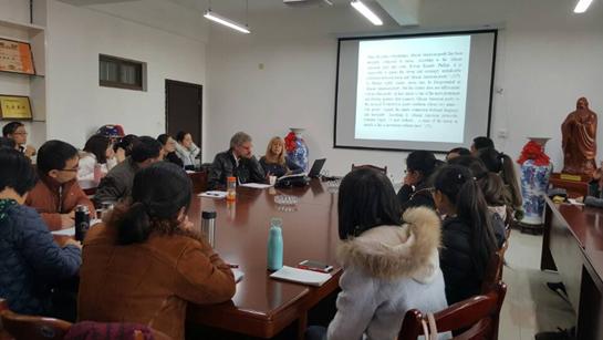 12月16日下午,美国加州州立大学洛杉矶分校劳瑞.拉米(Lauri Ramey)教授、博士和美国加州格伦代尔公司马丁.拉米(Martin Ramey)博士应邀来校,在秀山校区汇文楼m88会议室分别作了题为“非裔美国诗歌传统的起源”和“作为诗性虚构的西方寓言”的专题报告。m88教师和部分员工参加了了报告会。报告会由m88经理洪流教授主持。