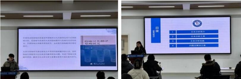 此次汇报会由2023级研究生陈启栋、王安妮、刘晨曦、李瑶等4位同学进行汇报。陈启栋同学就《隐喻汉英翻译原则研究》一书,分别从作者简介、文本内容简介、隐喻汉英翻译原则、启发四个方面进行了介绍。王安妮同学从文本分析视角出发,分析了《习近平谈治国理政》法治篇中体现的法治思想,汇报时重点介绍了文本分析定义、文本分析工具、实践过程等内容。刘晨曦同学就《山海经》进行了阅读汇报,主要包括文本简介、文本写作特点、文献价值、神话思维和哲学思想。李瑶同学分享了对《译道探微》部分章节的阅读体会,涵盖全书概况、选篇目的、启发、总结四部分。