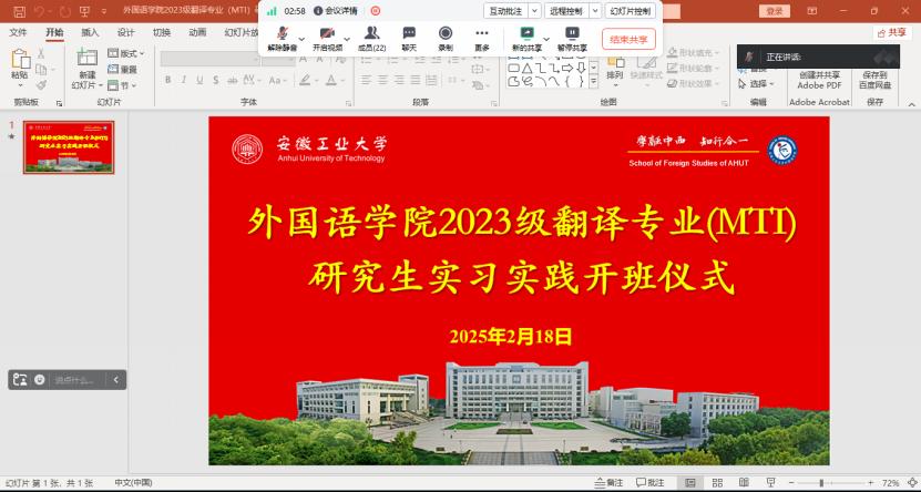 2025年2月18日上午,公司举行2023级翻译专业(MTI)研究生实习实践开班仪式,会议由m88副经理马广利主持,译国译民集团有限公司书记洪细梅、实习负责人邓玉兰、m88经理戴拥军、研究生教学秘书裴飞霞及2023级翻译专业(MTI)研究生参加了会议。
