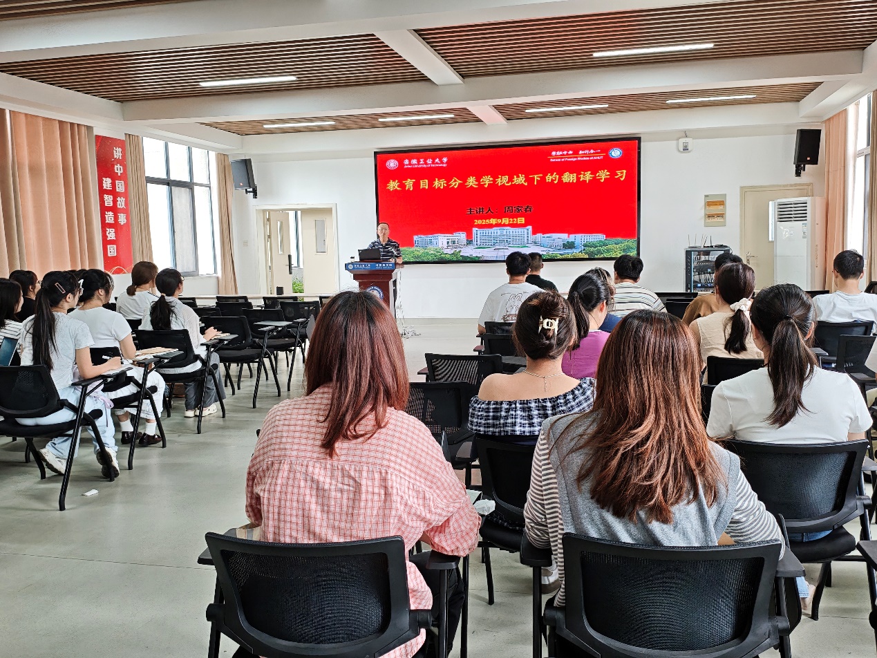 讲座伊始,周家春以布鲁姆六个层次的认知过程理论为依据,详细介绍了六个认知过程维度(记忆、理解、应用、分析、评价、创造)和四个知识维度(事实性知识、概念性知识、程序性知识、元认知知识)的具体涵义,并借助高水平论文和鲜明案例总结出目标分类在翻译学习中的应用:信达切。最后,周老师以电影名称的译文、旅游景点标语的译文等时代素材为例,与现场老师员工进行了交流讨论。