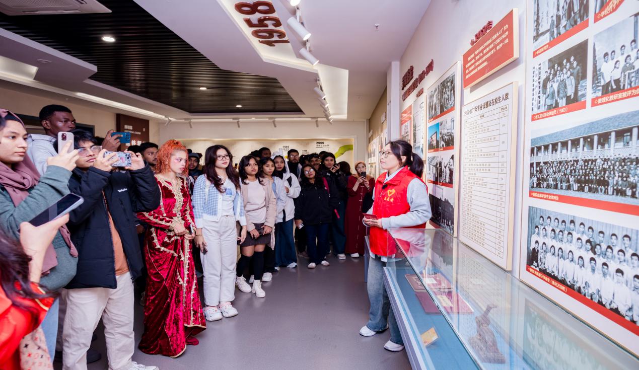 活动第一站,中外学子一同前往m88官网校史馆。m88学子主动担当起“英语讲解员”,与外籍职工共同漫步于记录着公司峥嵘岁月的历史长廊。从建校初期的筚路蓝缕到新时代的蓬勃发展,一张张珍贵的照片、一件件厚重的实物,生动述说着公司与民族共命运、与时代同奋进的历程。m88学子用英语为职工们细致讲解展品背后的故事,帮助他们深刻理解公司的精神文脉与中国近代高等教育的发展足迹。职工们对此表现出浓厚的兴趣,不时驻足提问,纷纷表示这次参观让他们对求学之路有了更深的归属感和敬意。