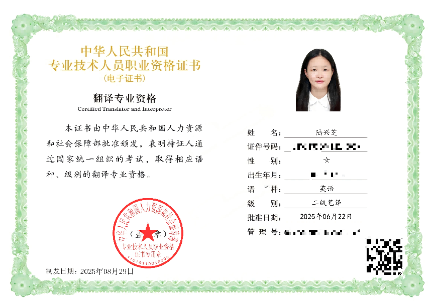 2025年全国翻译专业资格(水平)考试(China Accreditation Test for Translators and Interpreters,简称CATTI)成绩正式公布,m882022级英语专业本科生陆兴芝同学凭借扎实的专业基础和出色的综合能力,顺利通过英语二级笔译考试,获得英语二级笔译证书。