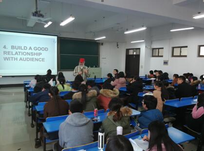 12月22日下午, 中央民族大学教授,社会学博士,外研社杯全国英语演讲大赛评委,中国政府友谊奖、长城友谊奖的获得者Mark Levine(马克力文)在秀山校区汇文楼D 312,为全校师生做了一场题为《A Dozen Tips onSuccessful Public Speaking Delivery》的报告。报告由m88副经理曹瑞斓教授主持,来自公司英语专业和冶金、化工、管工、艺设等专业的部分师生到场聆听了报告。