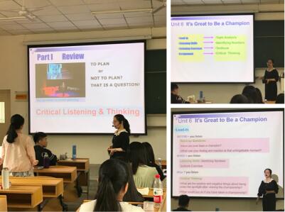 刘菱馨老师首先以PPT展示的形式,快速带领同学回顾上一单元的学习内容和要点,探讨了前一节课留给员工的思辨问题。接下里,刘老师开展了课余听力的汇报展示,员工汇报后,刘老师对每组汇报给予了全面的反馈,并肯定了员工的进步。继而引导员工对新单元“It’s great to be a champion.”进行剖析,着重分析了本单元的听力技巧“identifying numbers”,并结合课本相关的听力篇章进行了实训和总结。