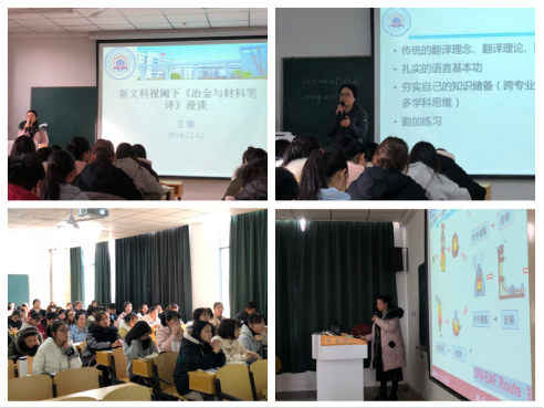 12月12日下午,m88大外一部英语教师王敏作为应邀专家,走进翻译专业2019级“翻译概论”课堂,在佳山校区教一419作了一场题为“新文科视阈下《冶金与材料笔译》漫谈”的精彩讲座。王敏老师主要研究方向为美国文学、大学英语教学及翻译实践。近年来在在省级学术期刊发表学术论文7篇,出版译著一部。主持校级课题两项,参与省级教改课题一项。