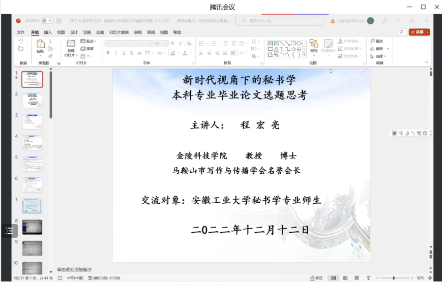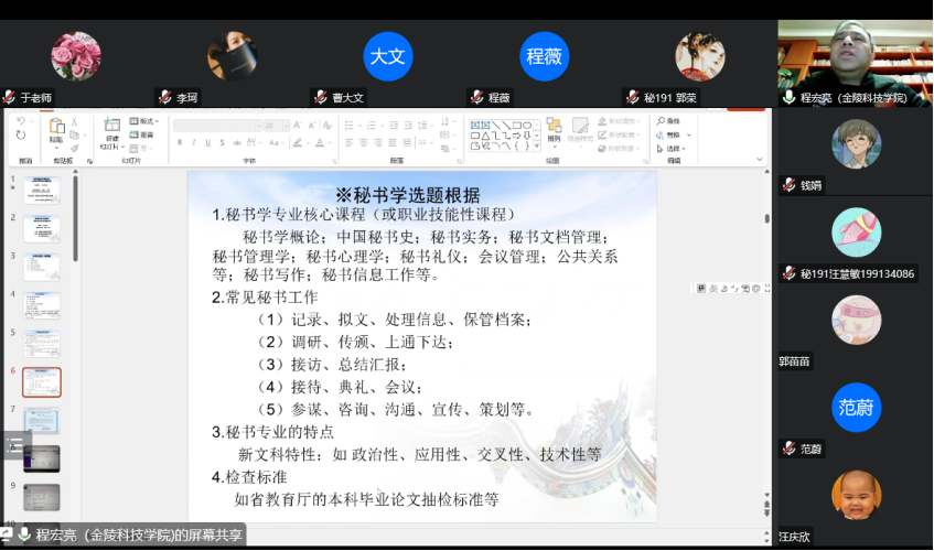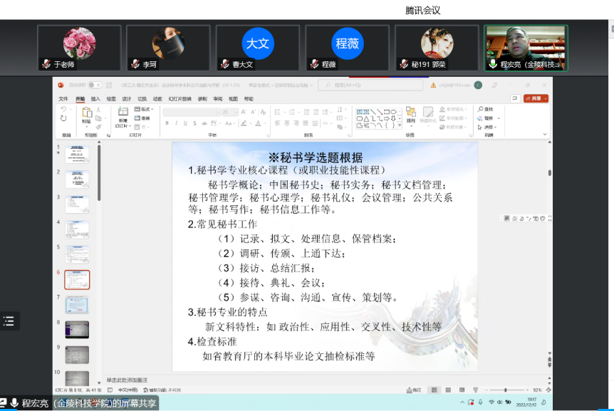 12月12日晚7点,m88采用腾讯网络视频会议的方式,邀请了金陵科技公司秘书学专业学科带头人程宏亮教授,面向秘书学专业教师和员工,举行了一场以“新时代视角下的秘书学本科专业毕业论文选题思考”为主题的讲座。会议由于春莉老师主持,秘书学专业教师和全体员工聆听讲座并和程教授展开了详细的交流。