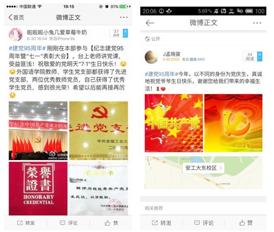 7月1日是中国共产党建党95周年,m88员工党支部组织员工党员开展了“百年还有一个‘我’”系列活动。“我”为“五”谐音,寓意中国共产党百年大庆还需要我们每一名党员的不懈努力。继“我听—红歌里难言的深情”“我看—电影中鲜活的历史”“我写—笔杆下庄严的文字”“我敬—岁月中忠诚的老人”四项活动后,又开展了“我愿—年后璀璨的明天”微博祝福活动。员工党员们在“七·一”建党节前一天,在各自微博上参与了“建党95周年“话题讨论,发表了主题活动期间参与的系列活动留影,表达了对中国共产党的祝福,展现了自己作为党员为党奉献的决心。