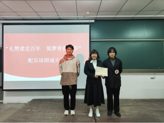 本次比赛以“礼赞建党百年 筑梦青春韶华”为主题,参赛的14组选手经过各班层层选拔,脱颖而出。选手们各展所长,以饱满的精神、激昂的演讲,搭配着制作精美的PPT,抒发着自己对党的热爱和赞颂,为我党成立100周年送上自己最真诚的祝福。比赛内容紧扣主题,展示形式丰富多彩,选手们各有千秋、难分伯仲,精彩的演讲不时赢得阵阵喝彩。经过激烈的角逐,最终第六组选手凭借《中华颂》获得比赛一等奖。赛后,评委和选手们合照,此次诗朗诵比赛在热烈的掌声中圆满结束。