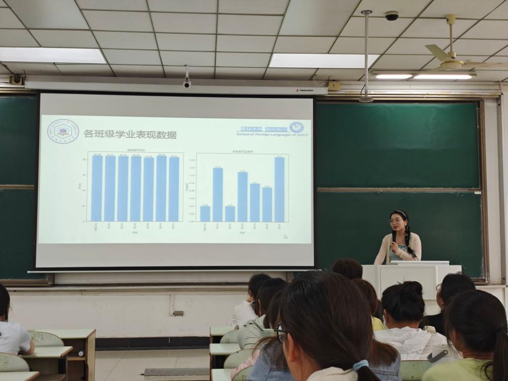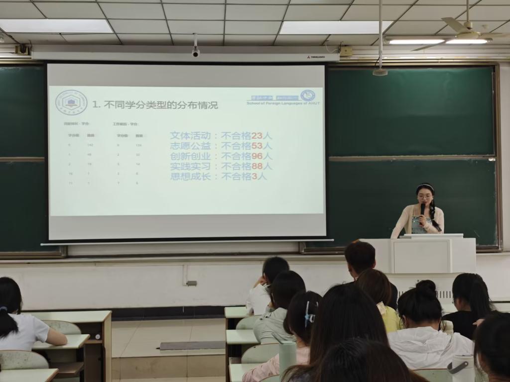 会议伊始,张庆芳对2023级各班级学业表现进行详细剖析,肯定了取得的成绩,也指出了普遍存在的薄弱环节,提醒同学们要对标培养方案,认真核查个人学分修读情况,特别是专业必修课、实践教学环节及各类模块选修课的完成进度。针对第二课堂学分达标情况,会议明确了当前各类型学分的不合格人数分布,张庆芳建议员工提前规划,主动参与各类活动,在丰富经历的同时确保学分达标,全面提升综合素质。