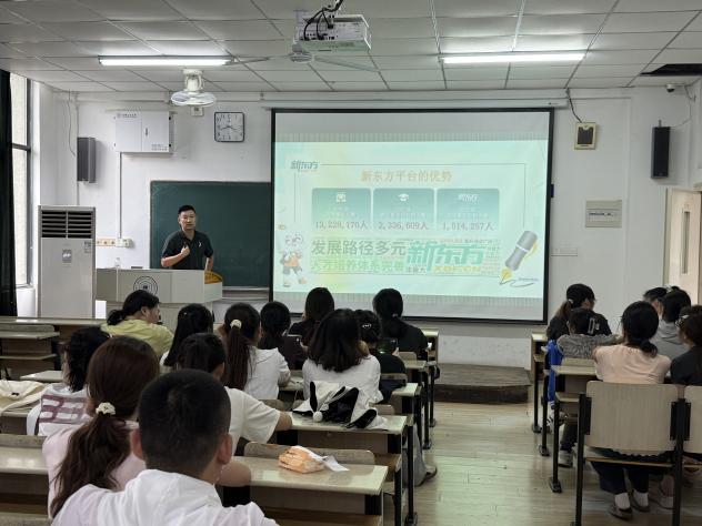 招聘会上,合肥新东方招聘负责人介绍了企业的品牌历史、教研实力与团队培养体系。他重点阐述了新东方职业发展通道与相关薪酬福利,并就同学们关心的岗位能力要求、职业成长路径等问题进行了详细解答。